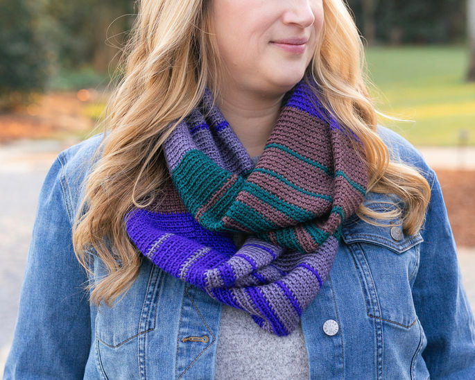 Simple, striking, and beginner-friendly, the Crochet Woolgatherer Scarf brings timeless stripes to life with effortless charm. Featuring eye-pleasing Fibonacci stripes, this DK-weight scarf is perfect for playing with color—use 2-4 colorways in all tonals, all variegated, or a combination to create a look that’s uniquely yours.